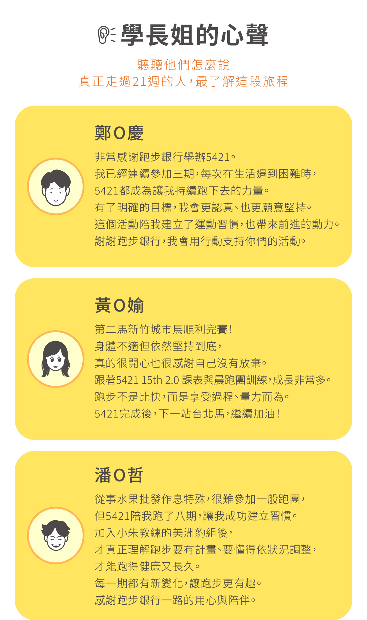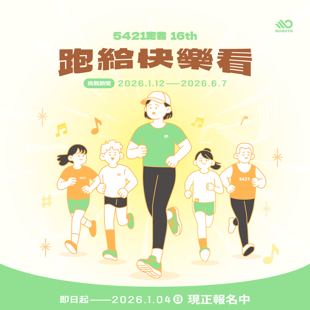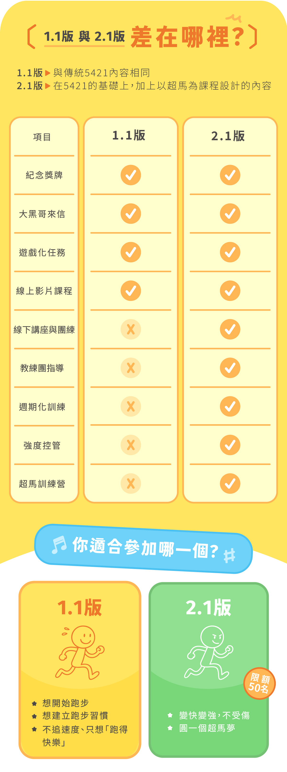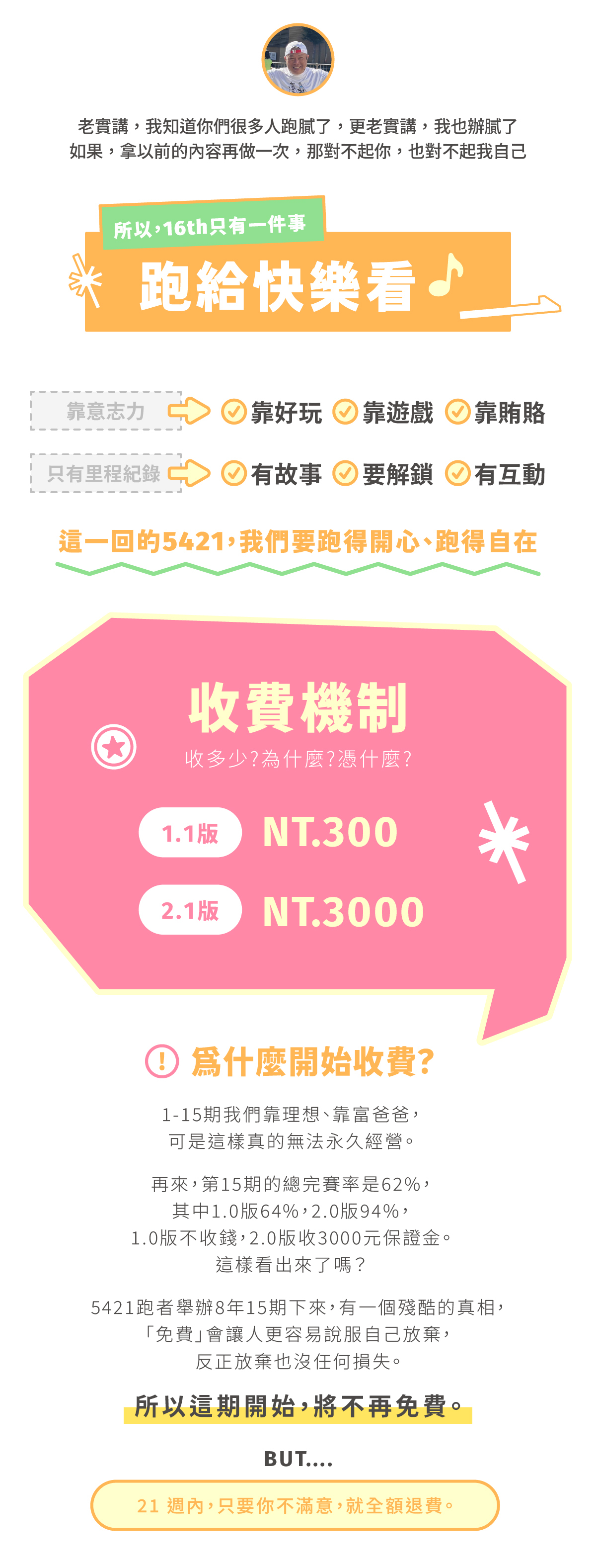 16th 不分跑力、不分速度、不分經驗,所有人都可以直接參加 1.1 版(NT$300),用最簡單的 5421 規則一路跑完 21 週。